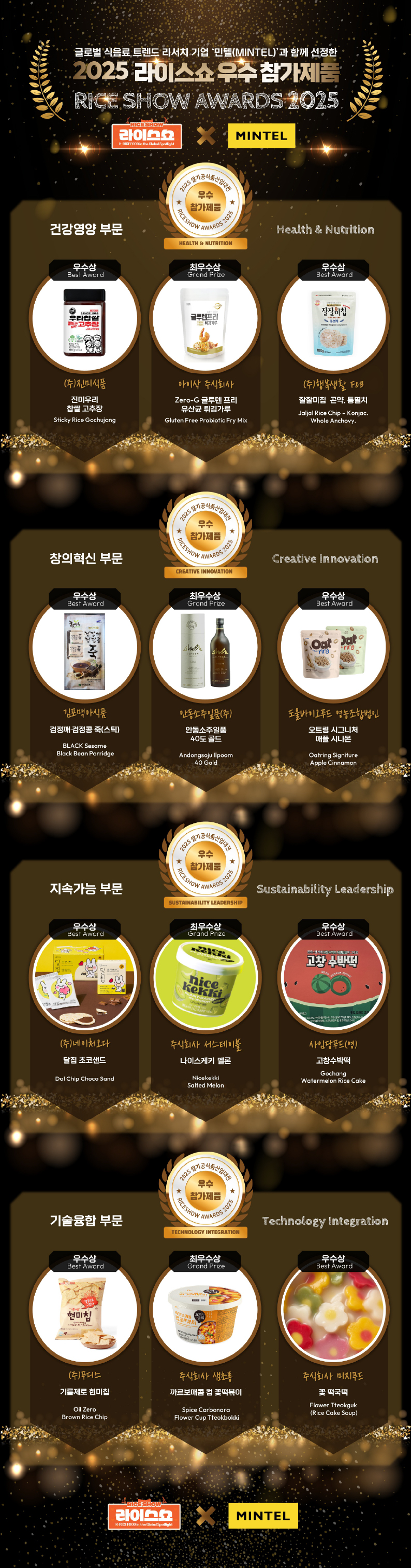 □ 출품 대상 2025 쌀가공식품산업대전 참가업체 46개사 대상 □ 시상 특전 ○ 사전홍보 지원 및 전시장(주제관) 내 전시 활용 ○ 협회장상 및 참가기업관 내 우수 제품 로고 부여 ○ 온라인 홍보 및 마케팅 지원 (온라인 전시관, B2B 바이어 뉴스레터, 보도자료 국내외 식음료 트렌드 리포트 홍보 등) □ 선정결과 ▶ 건강영양 부문 (Health & Nutrition Award) 최우수상 Zero G 글루텐 프리 유산균 튀김가루 (아이삭 주식회사)